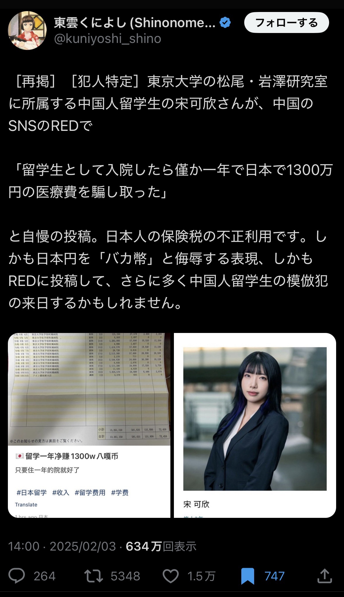 [再掲][犯人特定]東京大学の松尾・岩澤研究室に所属する中国人留学生の宋可欣さんが、中国のSNSのREDで
