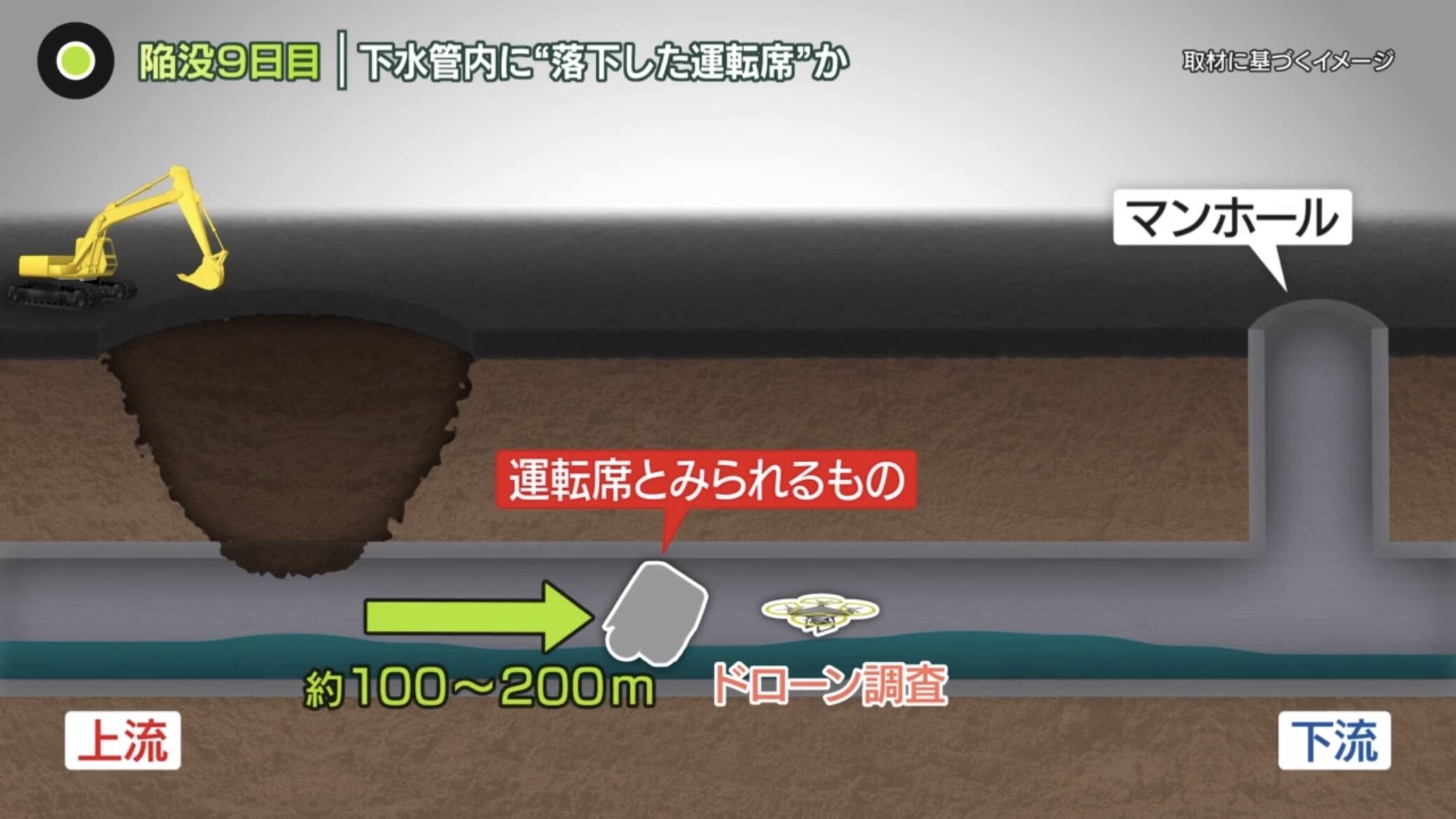陥没現場の100メートルから200メートル下流にあるのを、ドローンの画像で確認したということです。