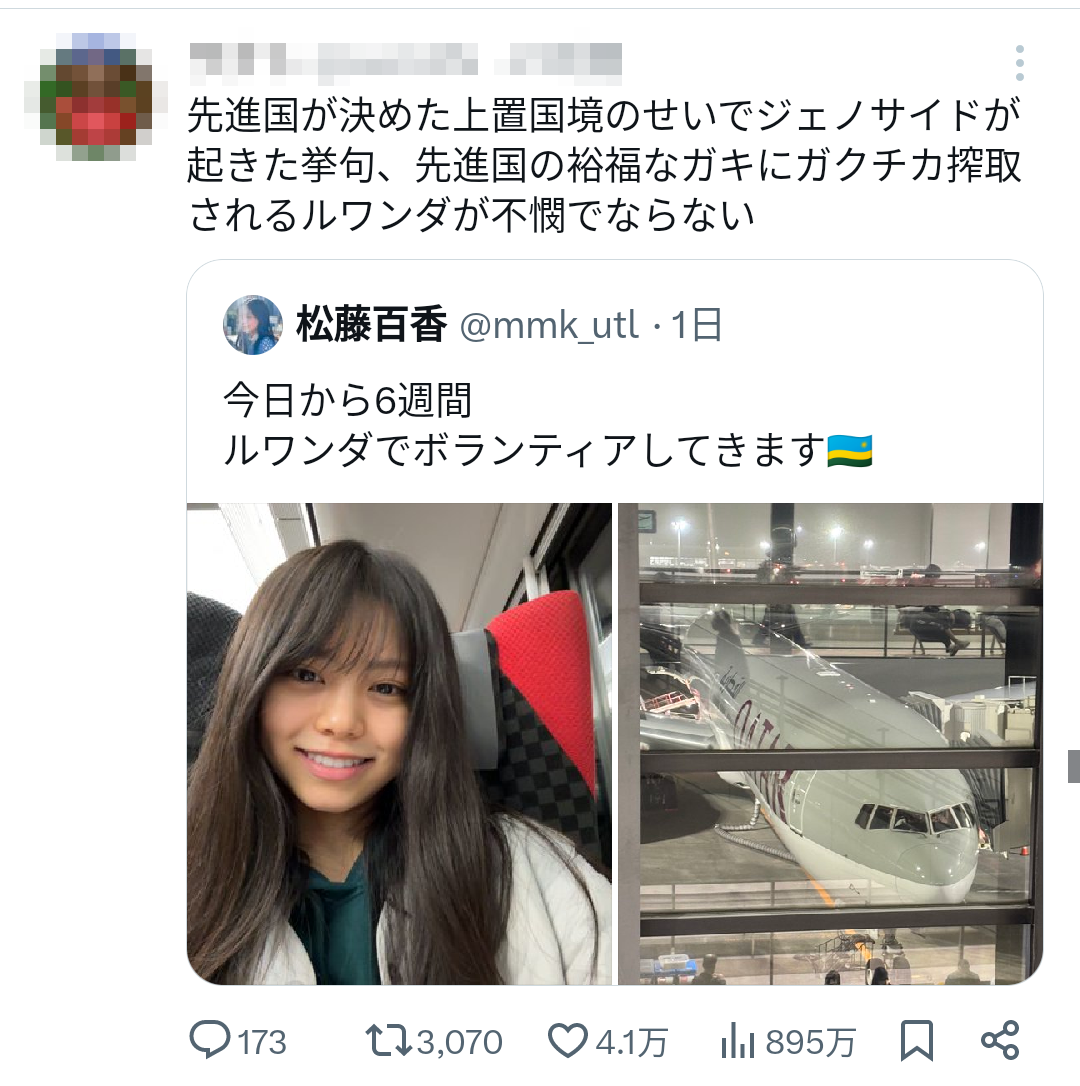 ルワンダでボランティアしてきます🇷🇼 pic.twitter.com/TsVTTKETb5— 松藤百香 (@mmk_utl) February 10, 2025