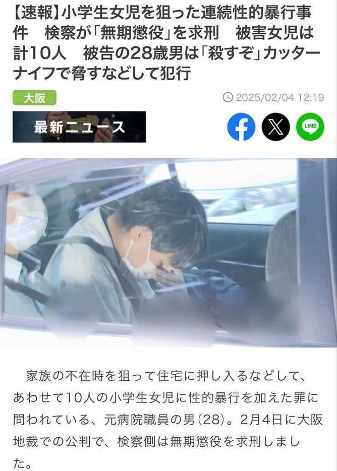 家族の不在時を狙って住宅に押し入るなどして、あわせて10人の小学生女児に性的暴行を加えた罪に問われている、元病院職員の男(28)。