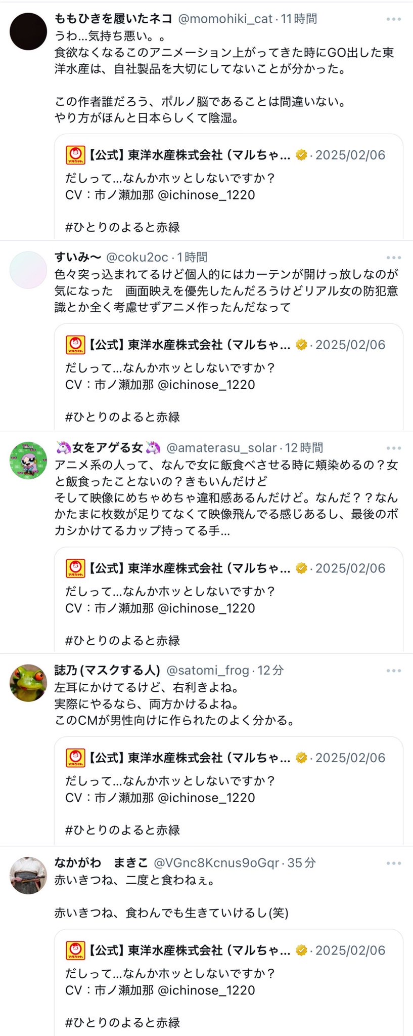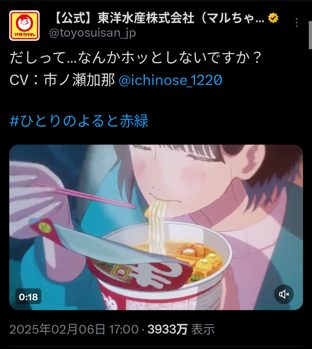 CV:市ノ瀬加那 @ichinose_1220#ひとりのよると赤緑 pic.twitter.com/G8IZ3I2dtM— 【公式】東洋水産株式会社(マルちゃん) (@toyosuisan_jp) February 6, 2025