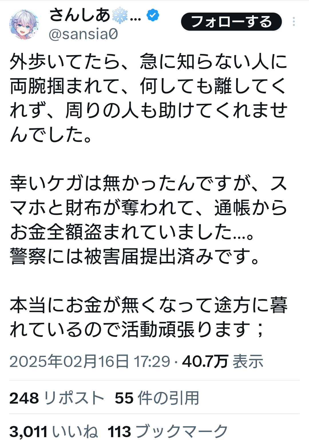 【悲報】ゲーム実況者「街を歩いていたら急に知らない人に腕を掴まれてスマホと財布を盗まれました!!😭😭」