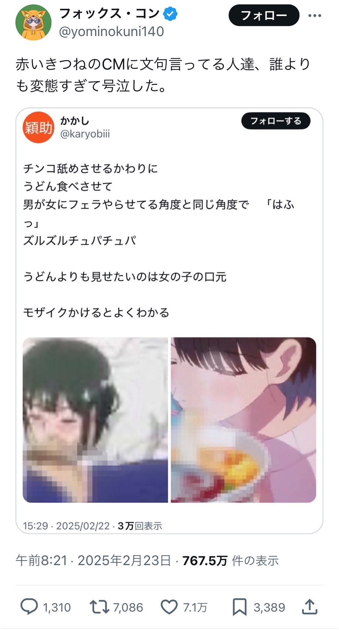 赤いきつねのCMに文句言ってる人達、誰よりも変態すぎて号泣した。 pic.twitter.com/lRSILh8F8m