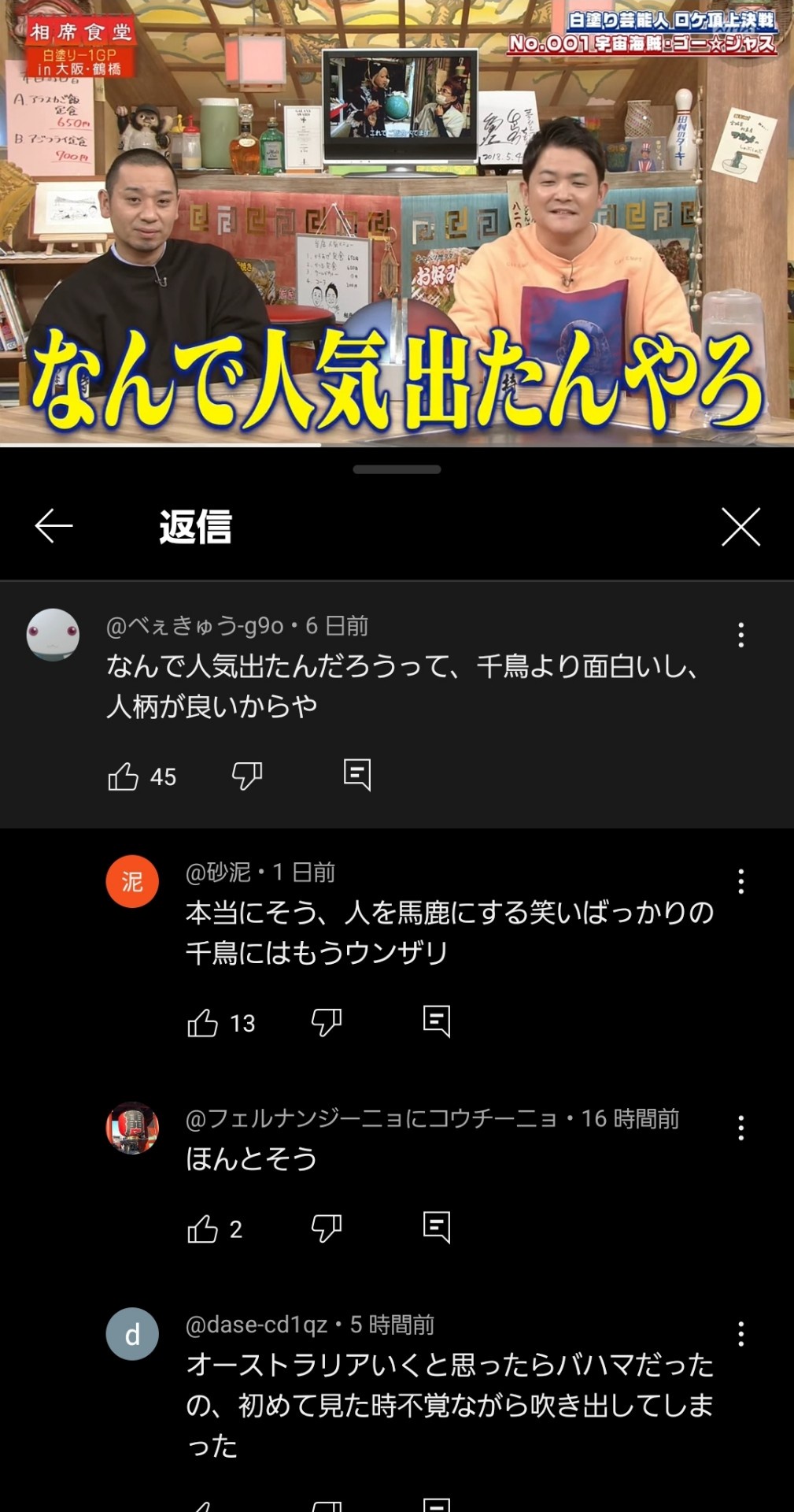 【悲報】相席食堂のゴー☆ジャス回を見たファン、千鳥にマジレスしてしまう 2025/2/26 キニ速 1:名無し: 2025/02/25(火) 19:27:21.260 ID:epdSeI64v 千鳥がバカにしてるのがあかんらしい 4:名無し: 2025/02/25(火) 19:30:33.714 ID:ODwOjsGVw ゴージャスでも千鳥でも笑った事ないしどっちも同じレベルだろ 5:名無し: 2025/02/25(火) 19:31:26.450 ID:j7NJ2Qws/ 芸人が芸人いじってその芸人ファンがキレるってその芸人が1番やりにくいやろ 続きを読む Source: キニ速
