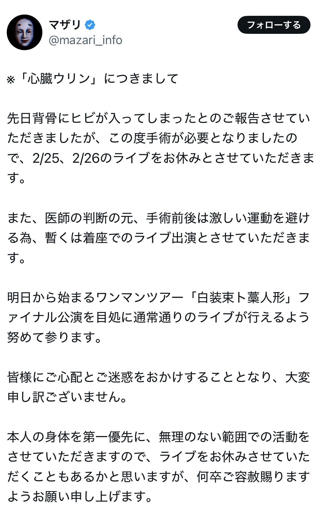 また、医師の判断の元、手術前後は激しい運動を避ける為、暫くは着座でのライブ出演とさせていただきます。… https://t.co/ZxorCgFGmp