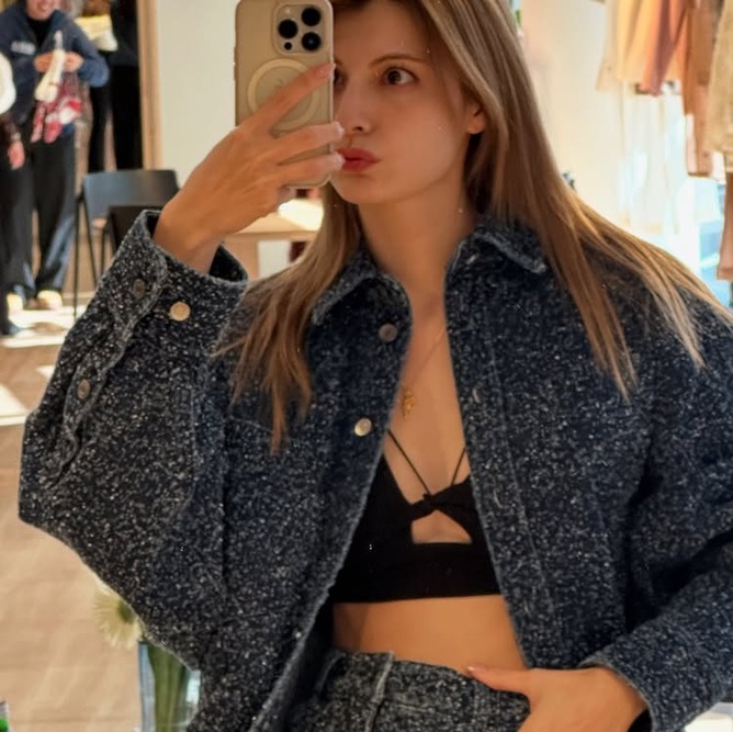 マギーは「STUDIO @hm 新作みにいってきた〜 つぶつぶデニムのセットアップかわいい!」とコメントし、複数枚の写真を投稿。ゆったりとしたシルエットのジャケット&パンツに見せブラを合わせ、トレンド感あふれる洗練されたスタイルを披露した。