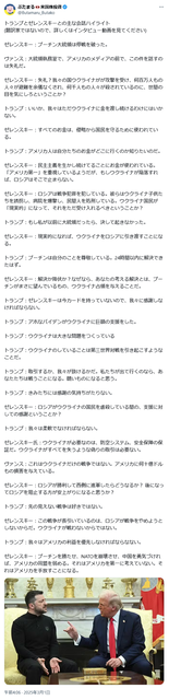 このなかで、トランプ大統領は「あなたは何百万人もの命を使って賭けをしている。第3次世界大戦をめぐって賭けをしている。あなたがしていることは、この国に対し非常に敬意を欠くことだ」と強い口調でゼレンスキー大統領を非難しました。