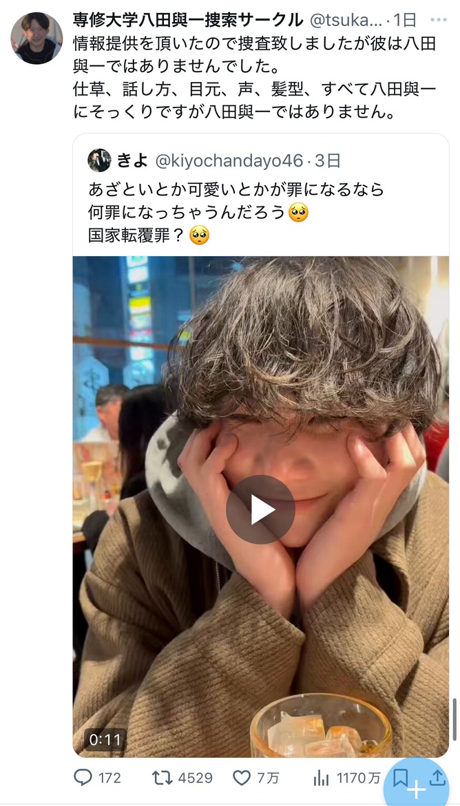 仕草、話し方、目元、声、髪型、すべて八田與一にそっくりですが八田與一ではありません。 https://t.co/kzEvVbsCvA— 専修大学八田與一捜索サークル (@tsukamaraneyo) February 27, 2025
