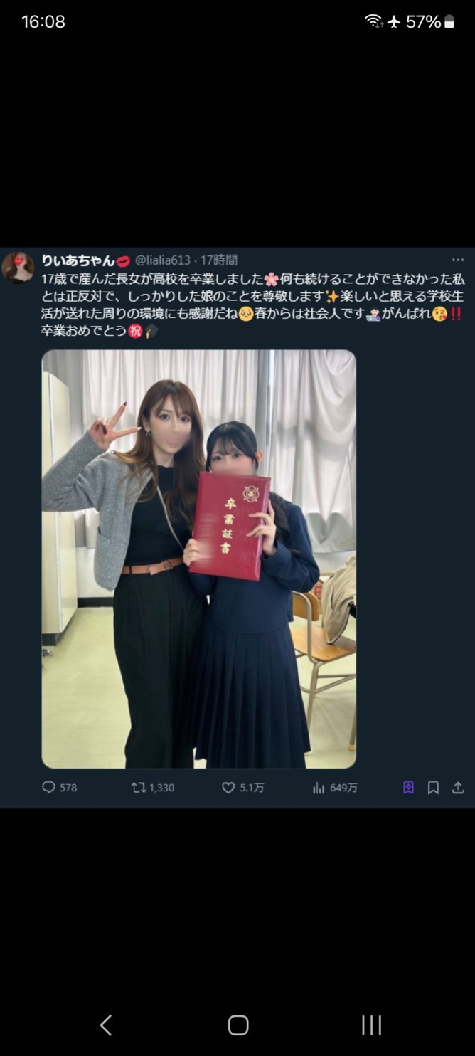 17歳で産んだ長女が高校を卒業しました🌸何も続けることができなかった私とは正反対で、しっかりした娘のことを尊敬します✨楽しいと思える学校生活が送れた周りの環境にも感謝だね🥺春からは社会人です👩🏻💻がんばれ😘‼️卒業おめでとう㊗️🎓 pic.twitter.com/e6MP2hIoqn