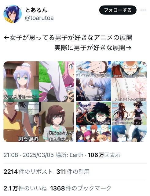 オタク「男子が好きなのはお色気シーンじゃなくて熱い戦闘シーンや展開なの!」 2025/3/7 キニ速 1:名無し :2025/03/06(木) 13:20:52.704ID:KUq0.7u8C 2:名無し :2025/03/06(木) 13:21:03.574ID:KUq0.7u8C これはわかる 13:名無し :2025/03/06(木) 13:24:28.593ID:mcFgrl0La どっちも好き定期 5:名無し :2025/03/06(木) 13:21:44.720ID:evGIwwkg1 おじさんは男子やないからね 続きを読む Source: キニ速