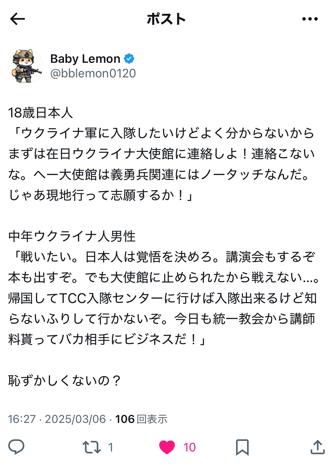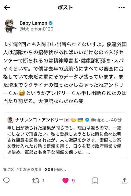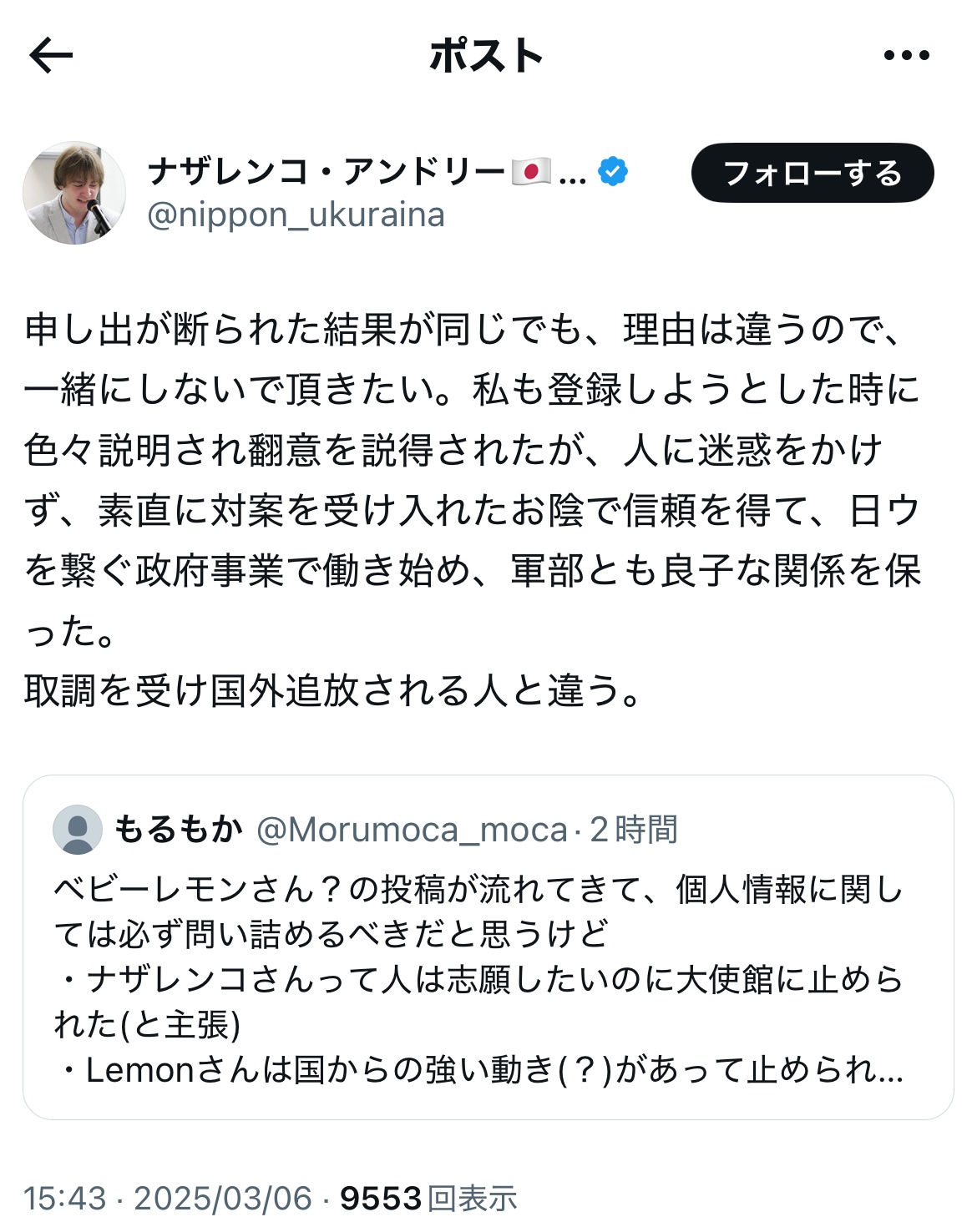 取調を受け国外追放される人と違う。 https://t.co/WnJ4JIxTD8— ナザレンコ・アンドリー🇯🇵🤝🇺🇦 (@nippon_ukuraina) March 6, 2025