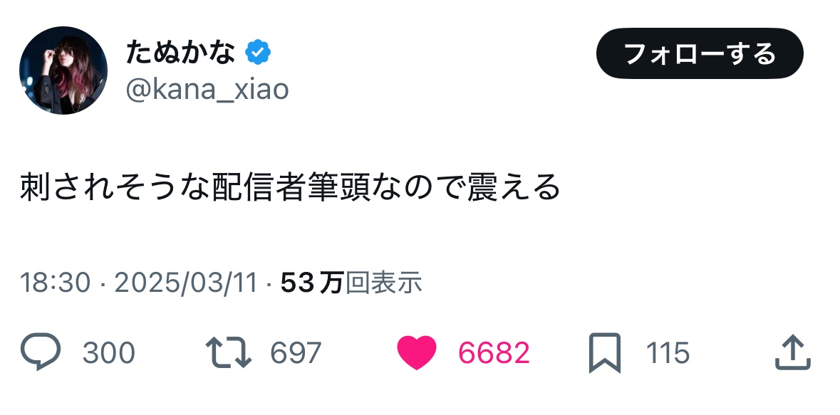 【悲報】たぬかな「ホビットさん怖いよ・・・・」 2025/3/12 キニ速 1:名無し: 2025/03/11(火) 20:35:59.749 ID:GSy8mJKLq 草 ※関連記事【速報】美人配信者さん、散歩配信中に中年男性に刺される 2:名無し: 2025/03/11(火) 20:36:13.278 ID:GSy8mJKLq しゃーない 3:名無し: 2025/03/11(火) 20:36:20.393 ID:UCuc0g4h2 そうなん? 4:名無し: 2025/03/11(火) 20:36:30.218 ID:XV9F1o6r7 そうでもねぇだろ 続きを読む Source: キニ速