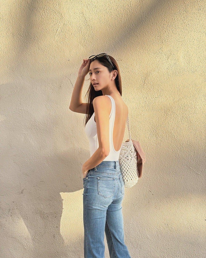 「背中フェチ??」として公開したのは、白のタンクトップにデニムというラフな出で立ち。ただ背中がパックリあいており、9頭身とも称される驚異のスタイルが惜しげもなく披露されている。