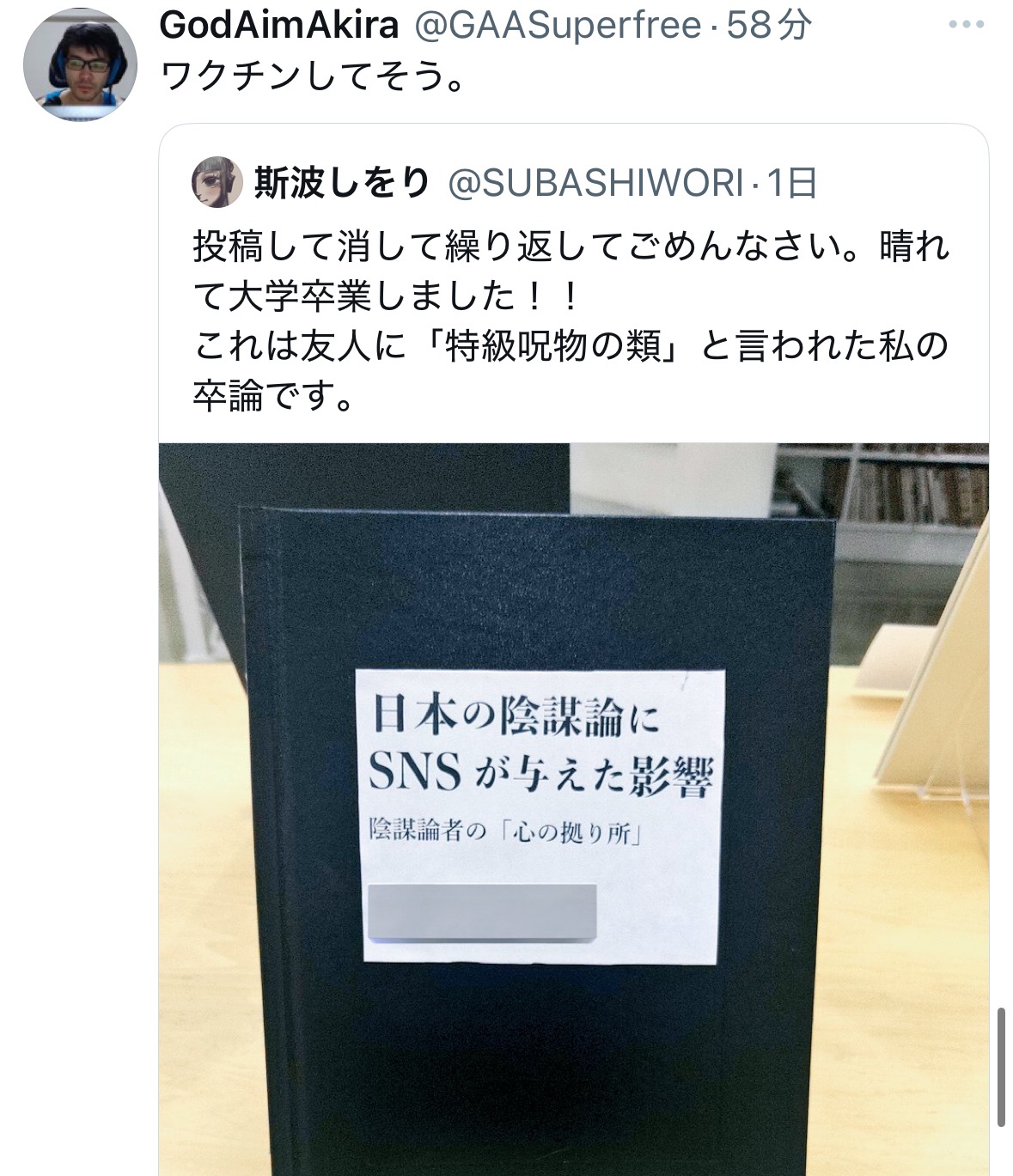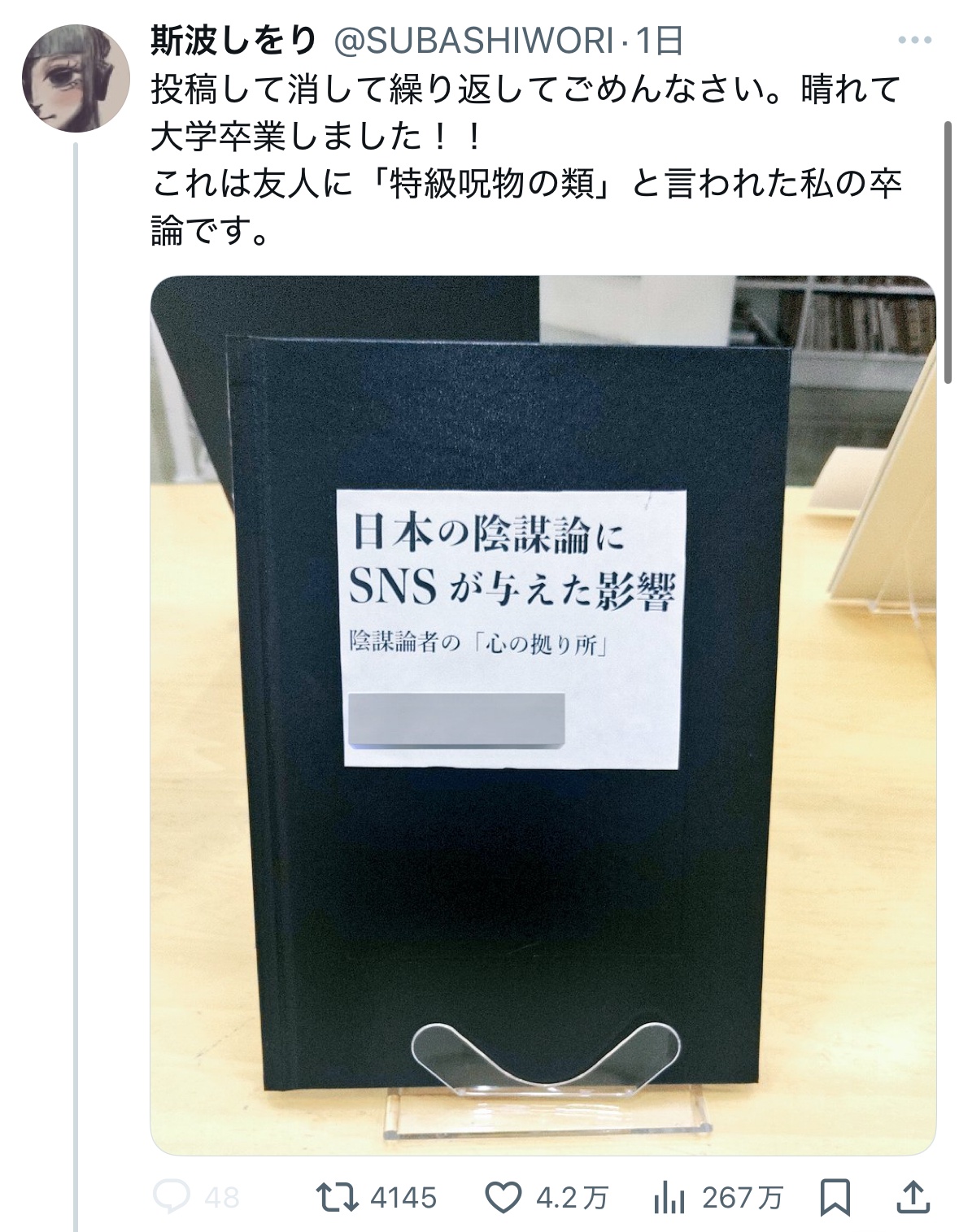 これは友人に「特級呪物の類」と言われた私の卒論です。 pic.twitter.com/ZJ0rdK9EDB— 斯波しをり (@SUBASHIWORI) March 16, 2025