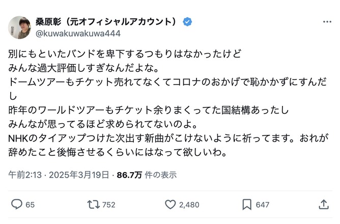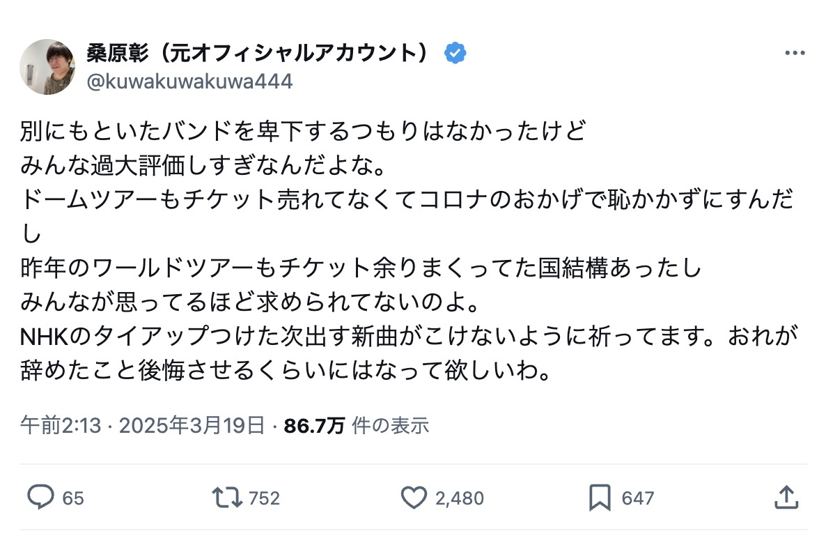 そんな中、桑原さんは19日にXで、「別にもといたバンドを卑下するつもりはなかったけどみんな過大評価しすぎなんだよな」と指摘した。