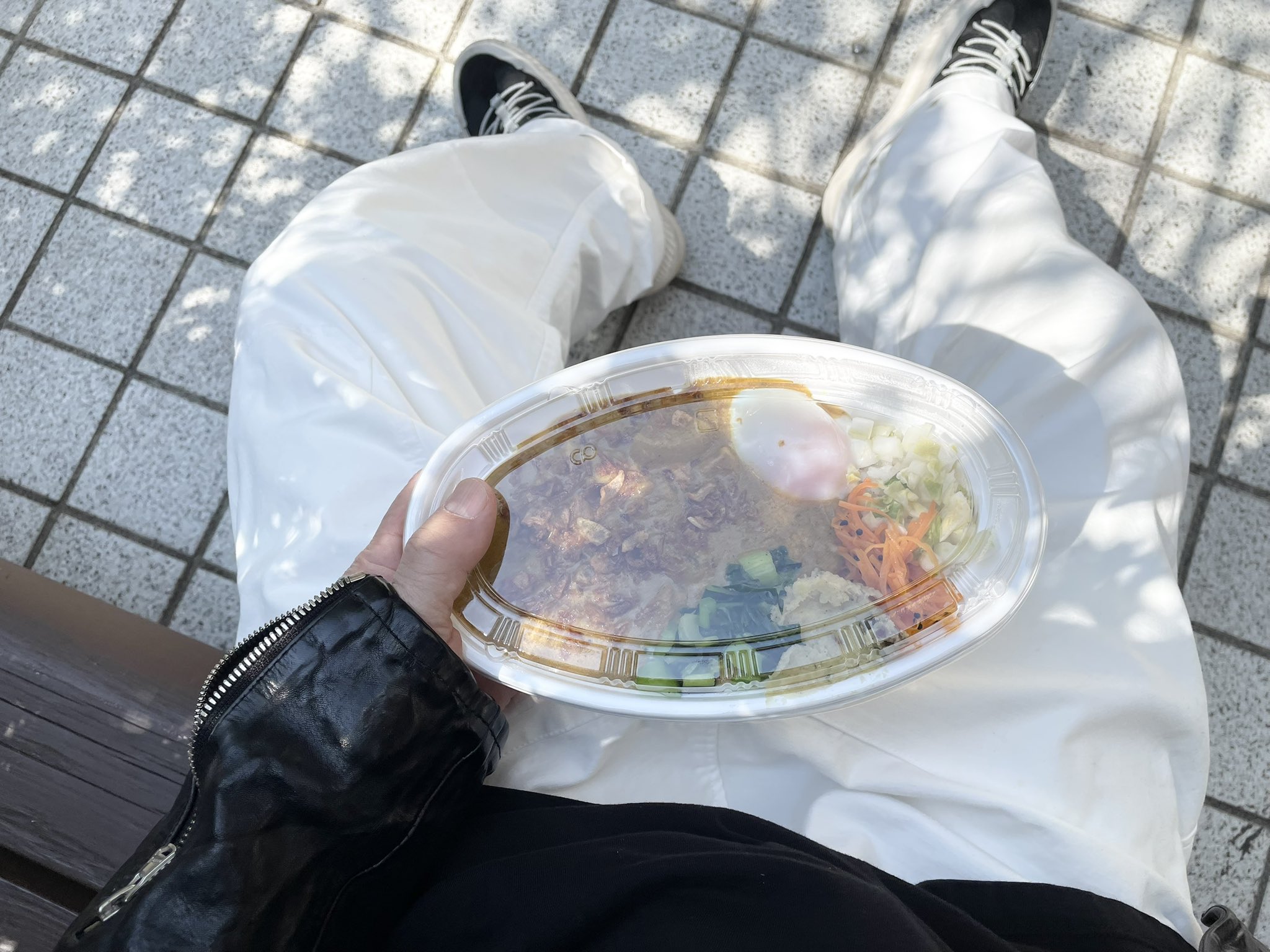 公園のベンチで食べようとカレーをテイクアウトしたが、おニューの白ズボンだと気づく