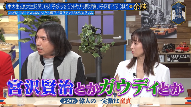 代表例として宮沢賢治やガウディの名前をあげると、カズレーザーも「ニュートンとかもそうです」と補足。ふかわが「私がもし親だったら、偉人になるのであれば童貞でいなさいと(教えます)」と話すと、スタジオに「えー!」「マジで!」と驚く声があがった。