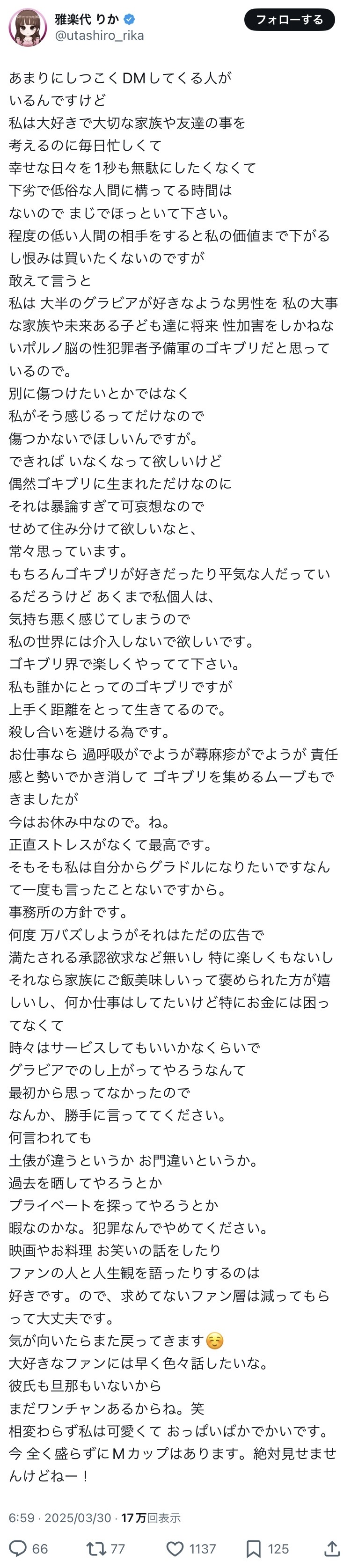 【画像】人気グラドルさん「グラビア好きは性犯罪者予備軍のゴキブリ」