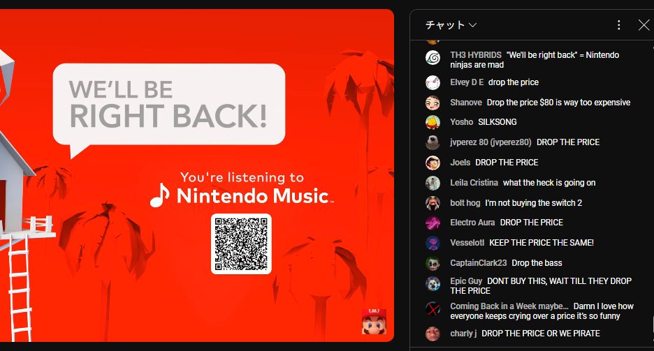 米任天堂のSwitch 2公式ゲームプレイ配信にて、「価格を下げろ」のコメントで荒れる事態にhttps://t.co/72OF6m1hGI pic.twitter.com/q6BmtEIFXK