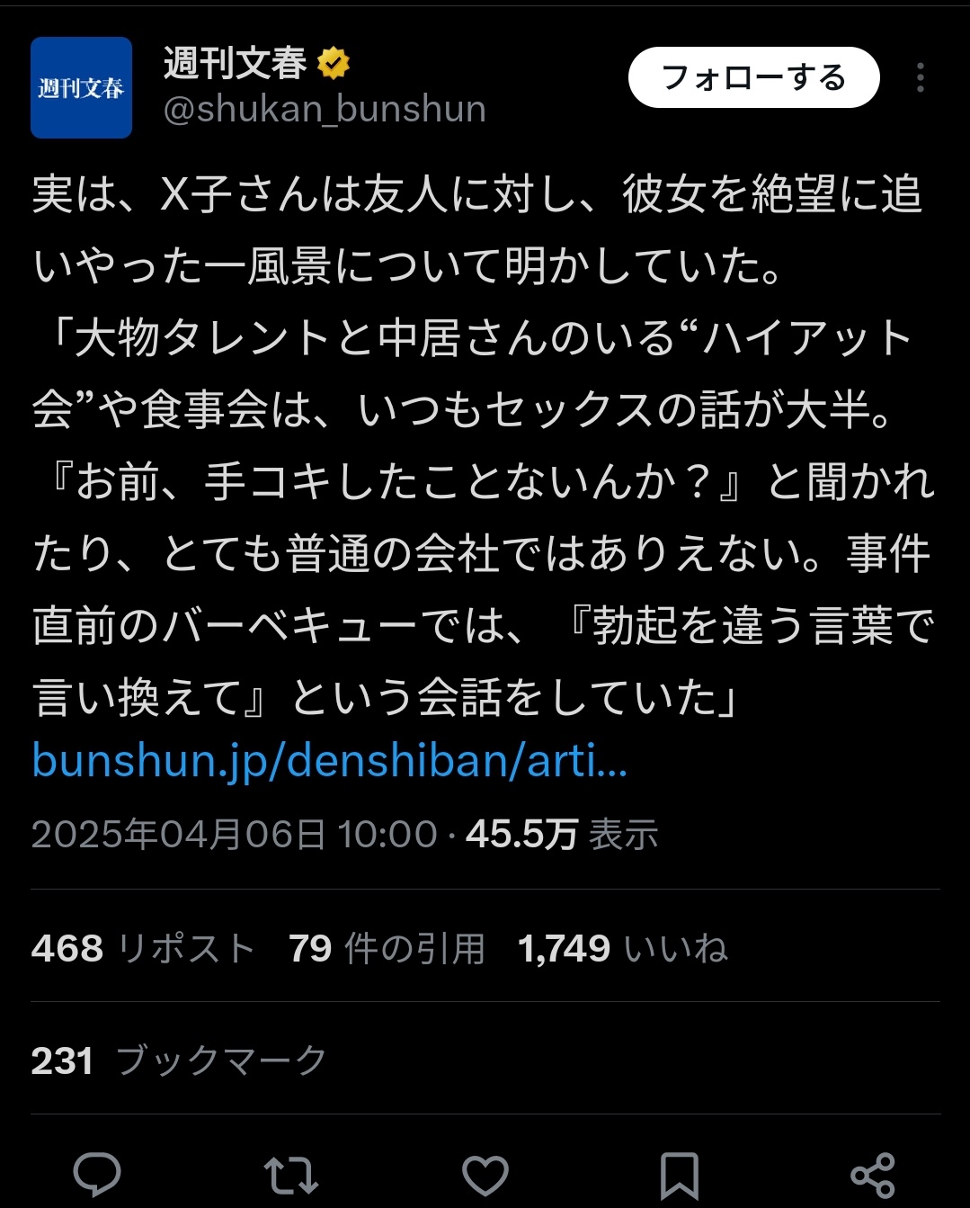 — 週刊文春 (@shukan_bunshun) April 6, 2025