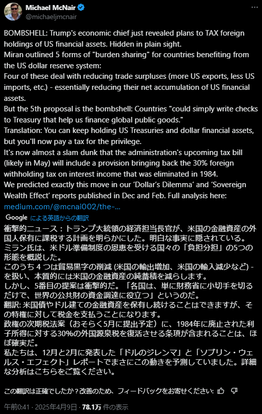 トランプの経済担当責任者が、米国の金融資産を保有する外国人への課税計画を明らかにした。