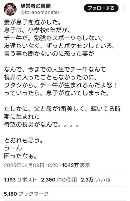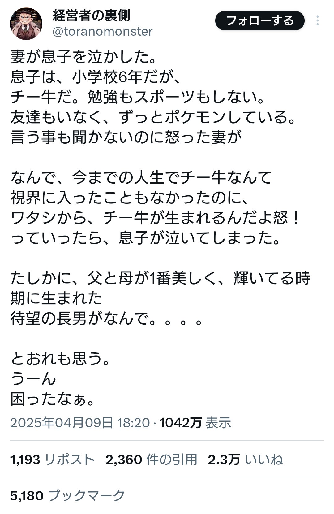 息子は、小学6年生だが、チー牛だ。←なんかすごい