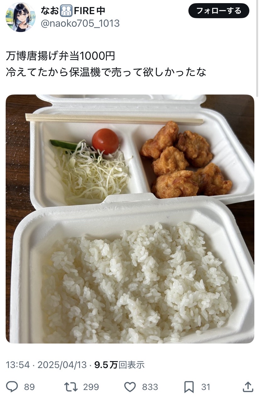 冷えてたから保温機で売って欲しかったな pic.twitter.com/F24gLAWeIq— なお👨👩👧👧FIRE中 (@naoko705_1013) April 13, 2025