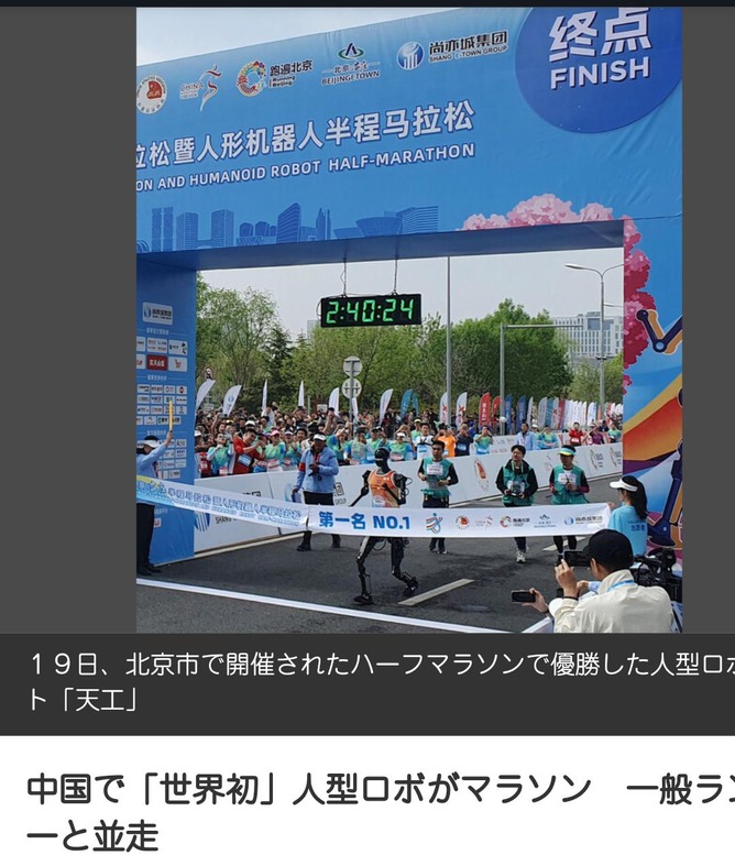 レースでは、出走直後に勢い余って壁に衝突してリタイアしたロボットが出たものの、多くは順調に走りだした。優勝したのは北京市内の新興企業が開発した「天工」で、2時間40分で完走。一般ランナーを含む大会記録は1時間02分だった。