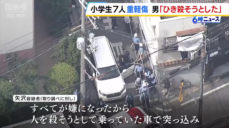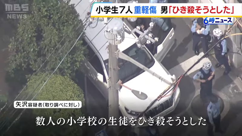 警察によりますと、矢沢容疑者は、小学生らを無差別に殺害しようとして大阪市西成区の路上で車を走行させ、ぶつけてけがをさせた疑いがもたれています。小学2年と3年の男児計6人は軽傷、小学2年生で7歳の女児が重傷だということです。