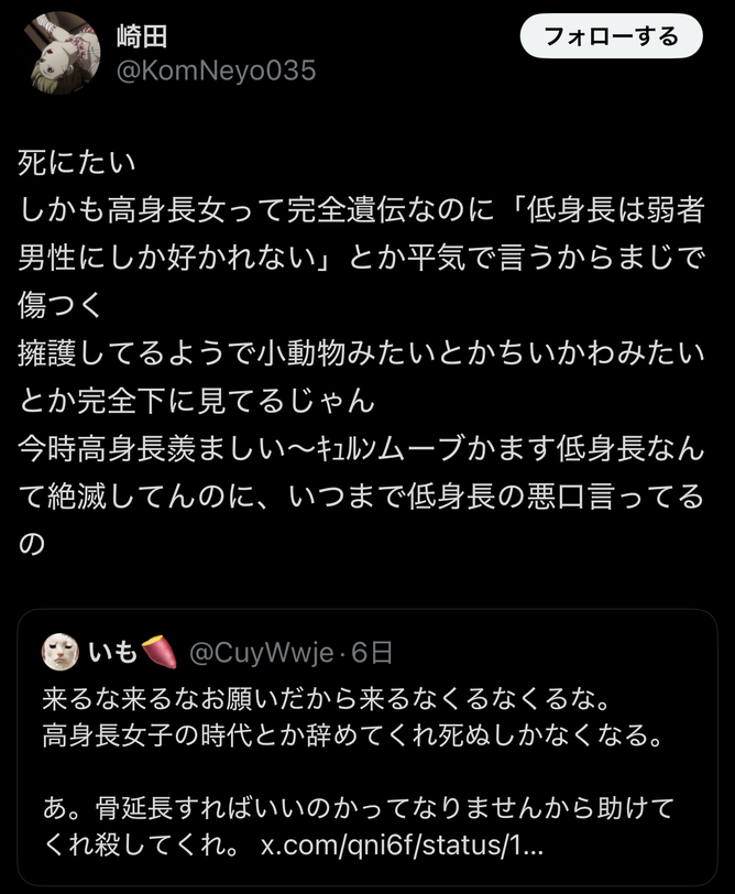 今時高身長羨ましい〜キュルンムーブかます低身長なんて絶滅してんのに、いつまで低身長の悪口言ってるの https://t.co/0Dg2WgTFgr— 崎田 (@KomNeyo035) May 19, 2025