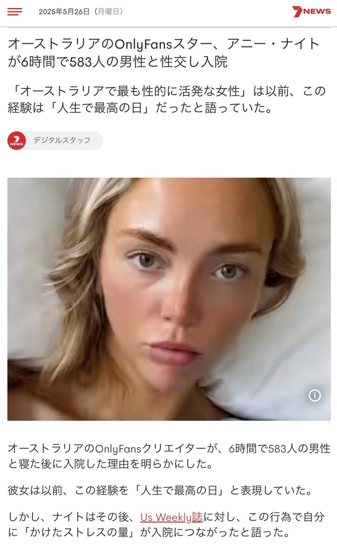 Aussie OnlyFans star Annie Knight hospitalised after having sex with 583 men in six hours