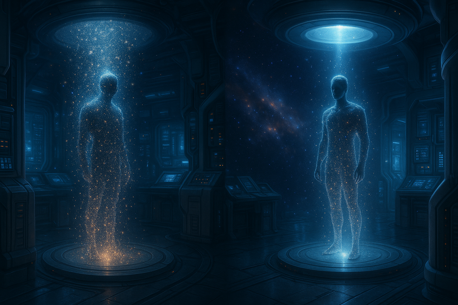 転送される人体は装置によってバラバラの素粒子に分解され、
