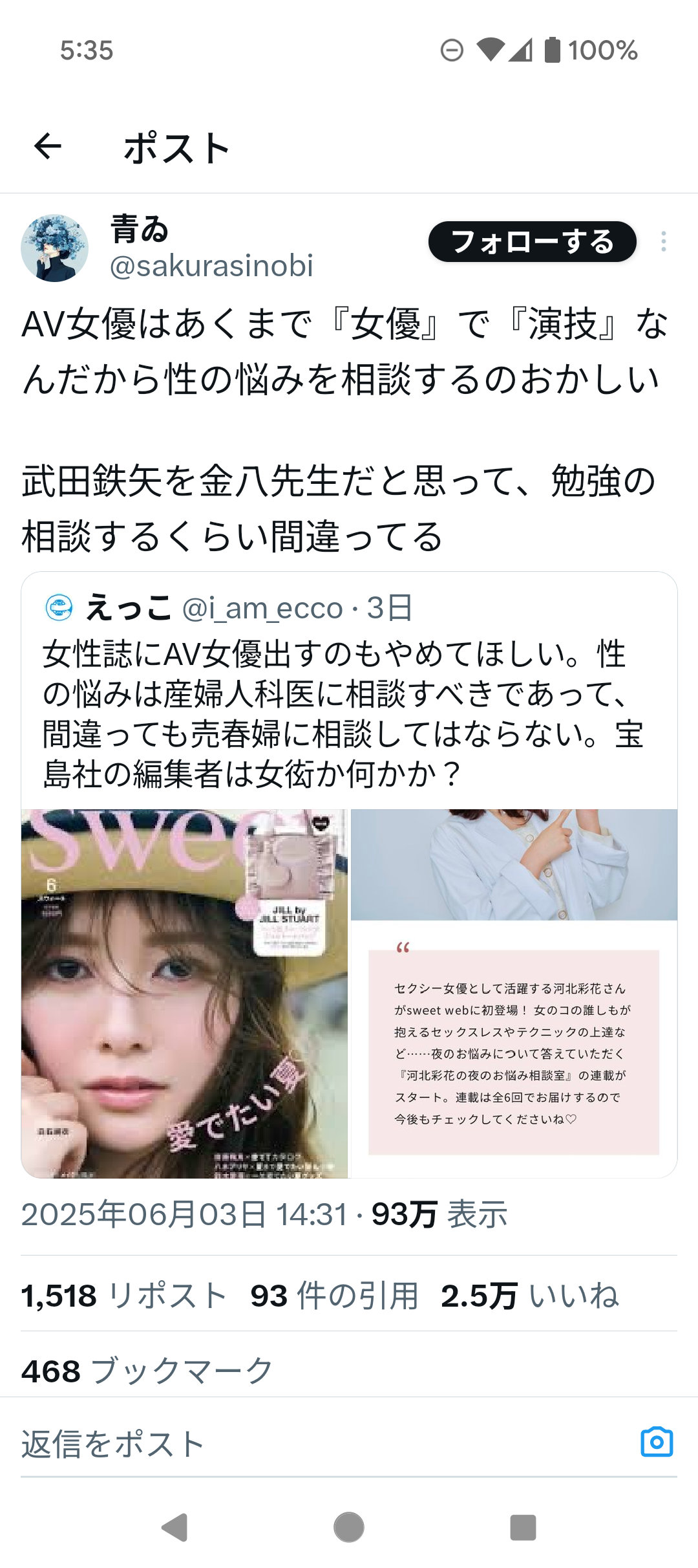 女性誌にAV女優出すのもやめてほしい。性の悩みは産婦人科医に相談すべきであって、間違っても売春婦に相談してはならない。宝島社の編集者は女衒か何かか? https://t.co/kTZpoc1bHl pic.twitter.com/woSHjdRqt8
