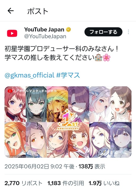 【画像】Youtube公式、アイマスに媚びるも「にわかバレ」しめちゃくちゃキレられる 2025/6/6 キニ速 1:名無し :2025/06/05(木) 07:27:17.538ID:BhQUwlHng まあこれは叩かれるわなぁ 7:名無し :2025/06/05(木) 07:28:45.756ID:C22rvWRd1 擦り寄るも何もアイマス側からのオファーやろ 8:名無し :2025/06/05(木) 07:28:46.780ID:sERzY8hfl えぇ… 続きを読む Source: キニ速