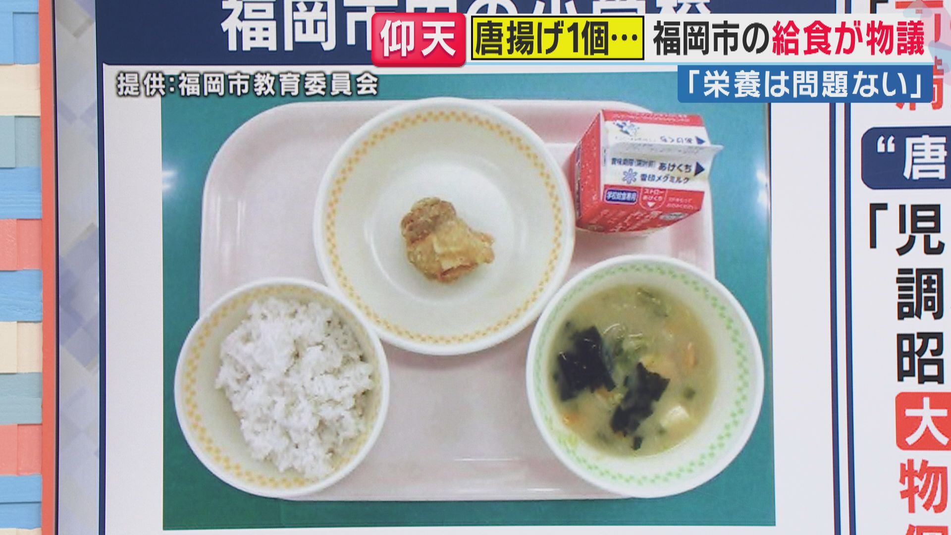 問題の給食は、唐揚げ一つのほかはご飯にみそ汁、牛乳だった。福岡市教委は必要な栄養は確保されているとしつつ、「器が大きいため、相対的に小さく見えてしまった。見た目も考えないといけなかった」としている。 pic.twitter.com/uioQZuFvTO