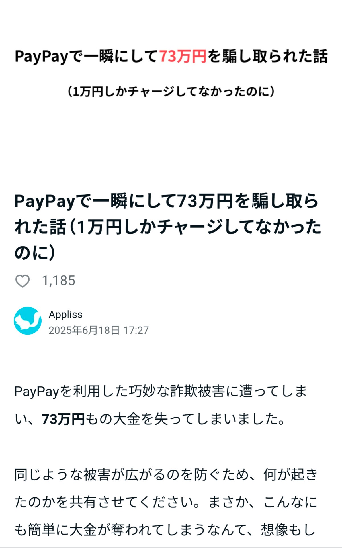 【追記ありx2】PayPayで一瞬にして73万円を騙し取られた話(1万円しかチャージしてなかったのに)|Appliss