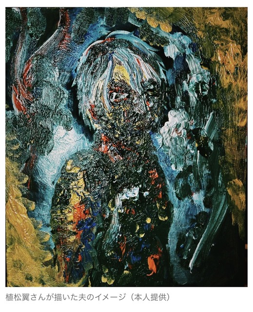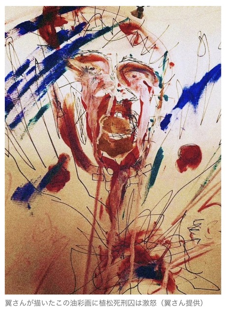 《その2枚が掲載された『創』7月号を、翼さんはさっそく夫の面会の時に差し入れたという。ところが植松死刑囚の反応はというと、それに並んで掲載したもう1枚の絵を、これは自分が死刑執行されたイメージを描いたのではないかと怒ったらしい。翼さんによると、それは全くの誤解で、実はその絵は自画像だという。彼女の抽象画は、どこか「不安」のイメージが表出されているのだが、夫はそれを自身の死刑執行への不安に重ねてしまったらしい。》