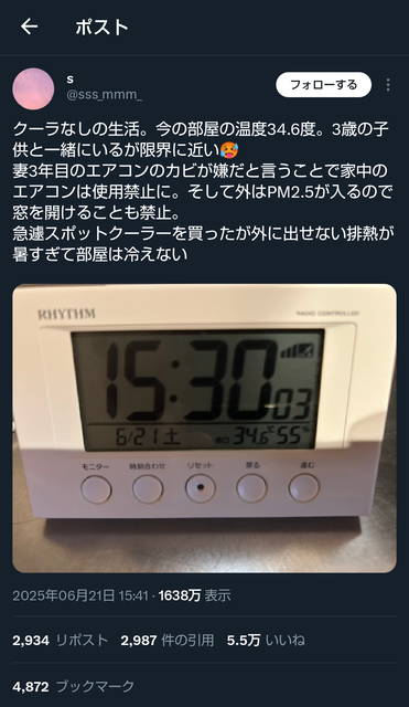 急遽スポットクーラーを買ったが外に出せない排熱が暑すぎて部屋は冷えない pic.twitter.com/BJedlah4Lh— s (@sss_mmm_) June 21, 2025