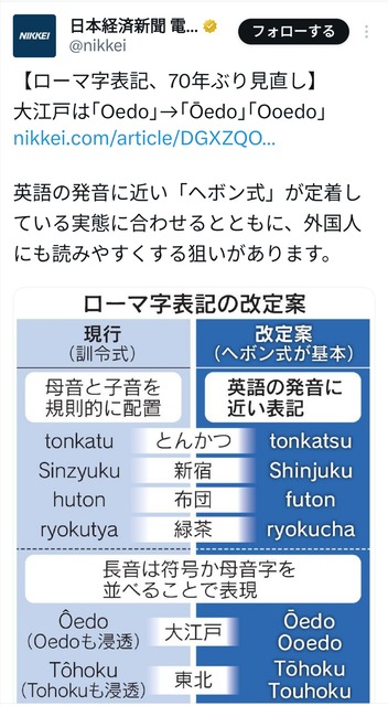 大江戸は「Oedo」→「Ōedo」「Ooedo」 ローマ字表記、ヘボン式に – 日本経済新聞
