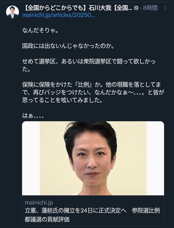 都知事選で知名度以外取り柄がないのバレたからしゃあないやろ