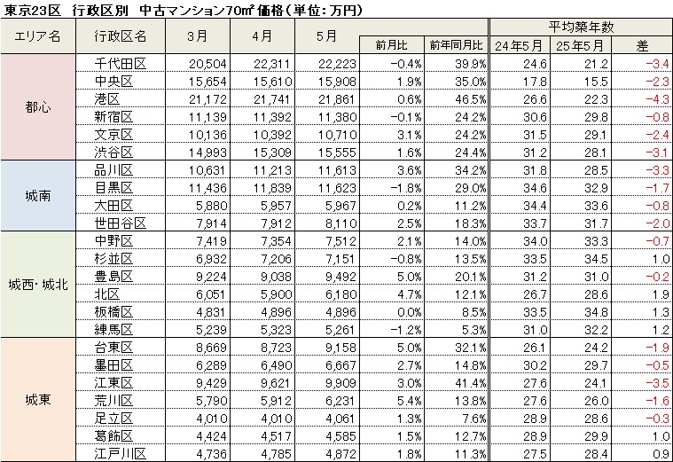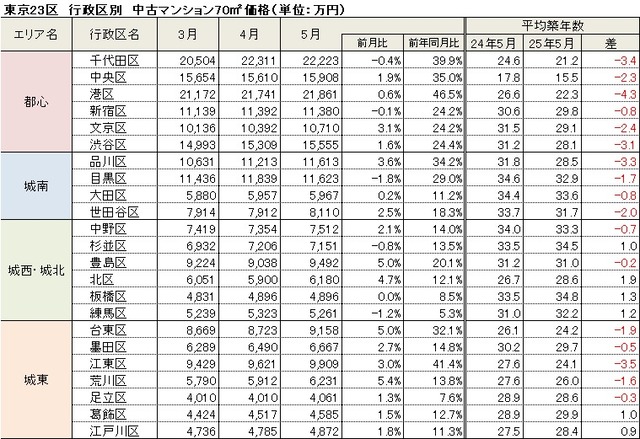 不動産調査会社の東京カンテイ(東京・品川)が23日に公表した5月の中古マンションの平均希望売り出し価格は、東京23区で前月比3.1%高の70平方メートル当たり1億88万円だった。調査を始めた2004年1月以降で、東京23区の平均として初めて1億円を超えた