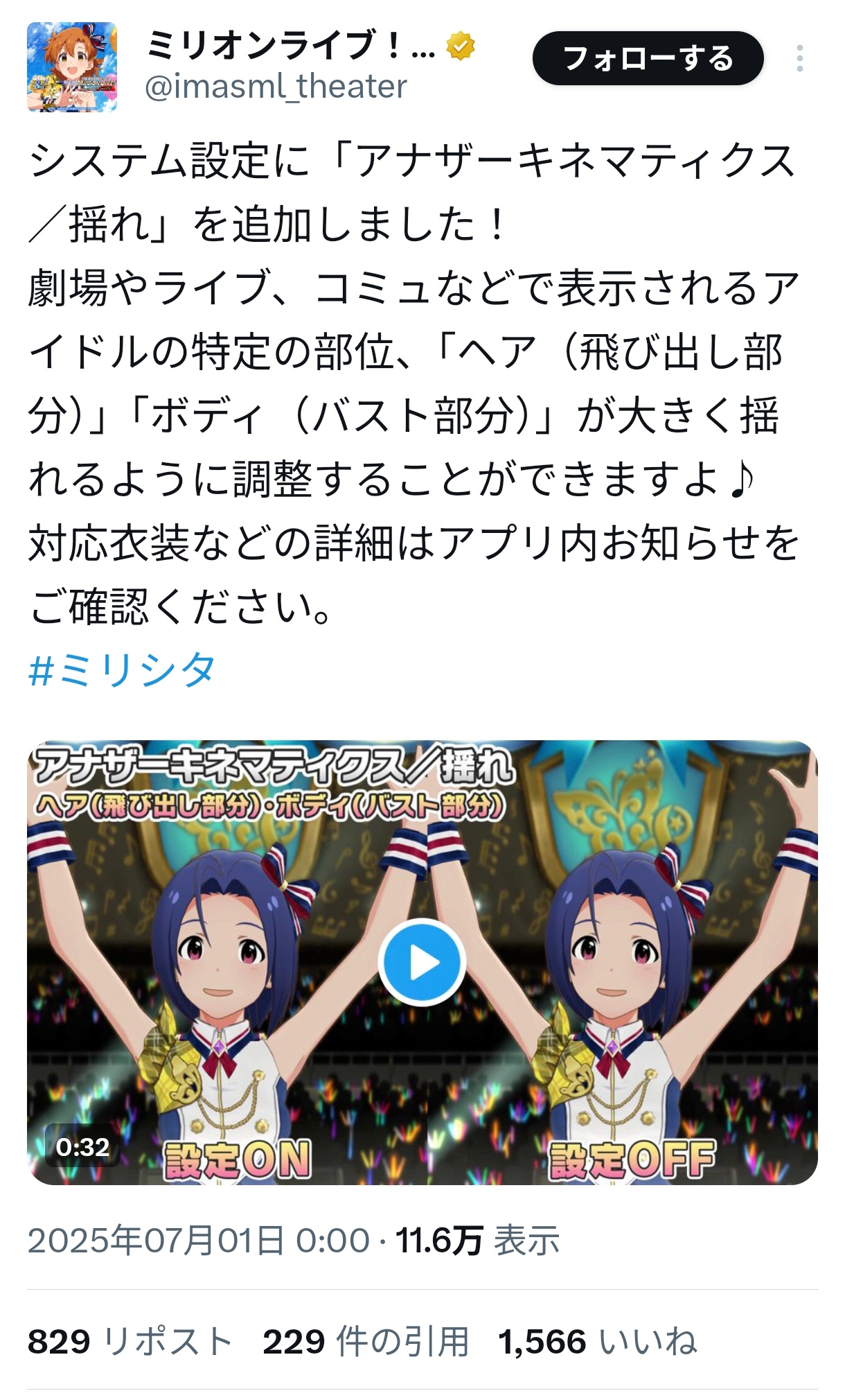 対応衣装などの詳細はアプリ内お知らせをご確認ください。#ミリシタ pic.twitter.com/p4j8MC0a5X— ミリオンライブ! シアターデイズ【公式】 (@imasml_theater) June 30, 2025