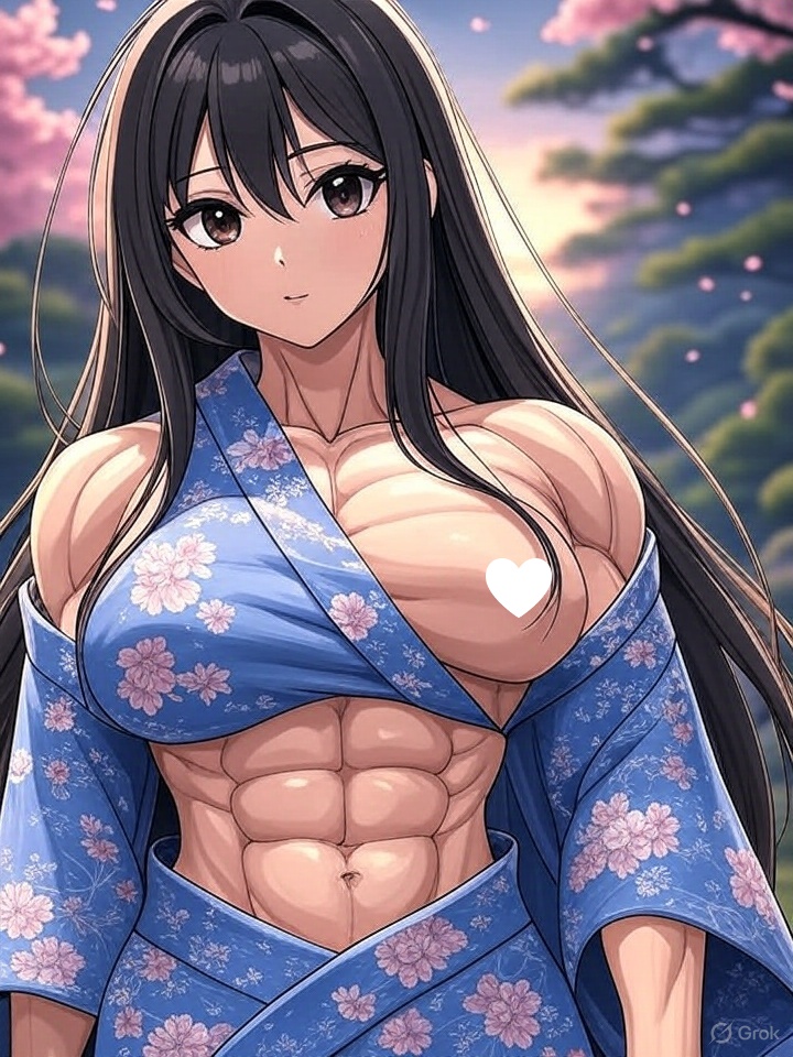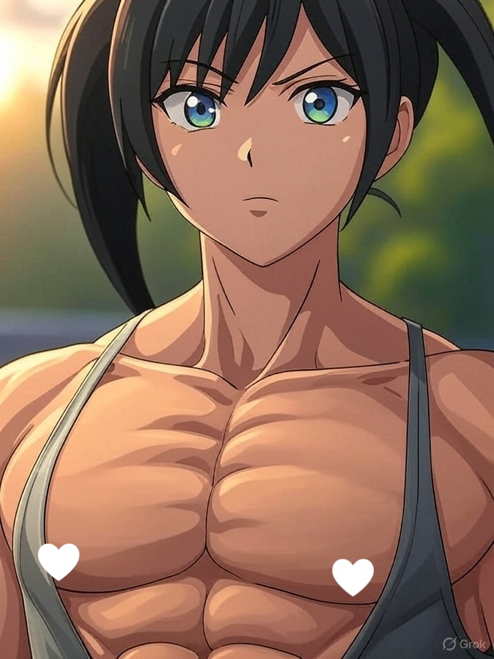 首から上は日本の萌えアニメの女性キャラ、首から下はマッチョの男性の画像を生成して 首と胸周りの筋肉が見えるように、下着は生成しないで