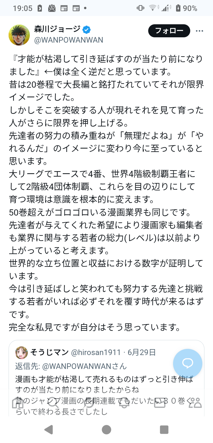 この投稿に森川氏は「『才能が枯渇して引き延ばすのが当たり前になりました』←僕は全く逆だと思っています」と言及。「昔は20巻程で大長編と銘打たれていてそれが限界イメージでした」とした上で、「しかしそこを突破する人が現れそれを見て育った人がさらに限界を押し上げる。先達者の努力の積み重ねが『無理だよね』が『やれるんだ』のイメージに変わり今に至っていると思います」と、長期連載作品が増えた経緯を推測した。