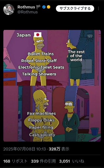 このミームは、「日本は最先端技術を持ちながら、同時に古い技術にも依存している」という二面性を皮肉っぽく表現しています。