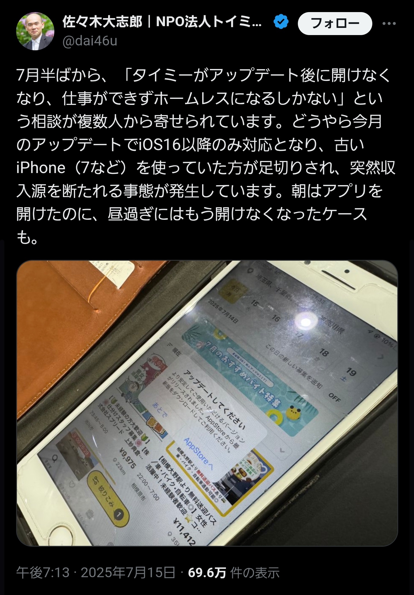 タイミーに生活かけてるやつがiOS15以上の端末持てるわけねーだろ
