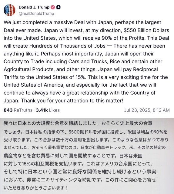 【速報】トランプ大統領 「日米交渉で合意」と投稿 “対日関税は15% 日本が米に5500億ドル投資”(FNNプライムオンライン(フジテレビ系)) – Yahoo!ニュース