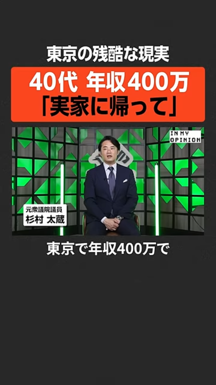 これに杉村氏は、「東京で一人暮らしで賃貸マンション」の人はお金が貯まりにくいとし、「気分を悪くしないでほしいんですけど」と前置きしつつ、「上京してきて40(歳)になって年収が400万(円)に満たない方は、ぜひ地方の移住(を)」と提案した。