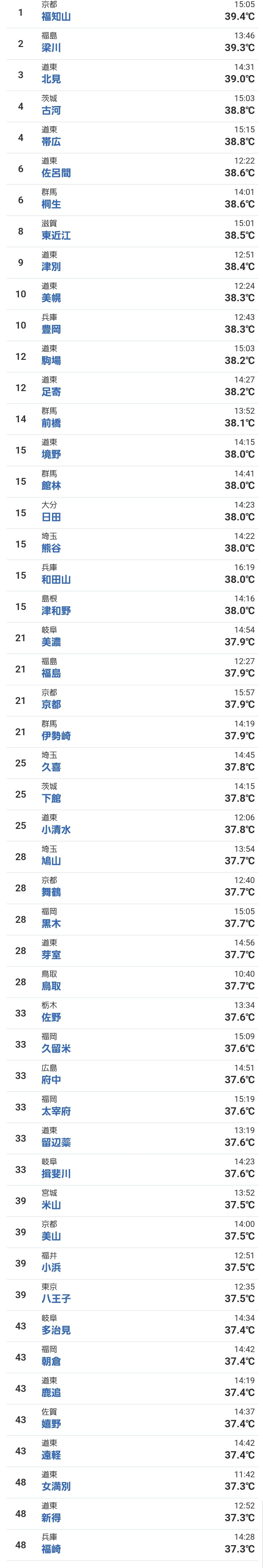 【日本終了】今日の気温ランキング1位・福知山39.4℃ 2位・梁川39.3℃ 3位・北見39.0℃ ←全国が灼熱地獄へ 2025/7/24 哲学ニュースnwk 1: 膝十字固め(茸) [DE] 2025/07/24(木) 17:13:02.88 ID:22Wn/fLD0● BE:567637504-PLT(51000) https://weathernews.jp/onebox/amedas/ranking/ 続きを読む Source: 哲学ニュースnwk