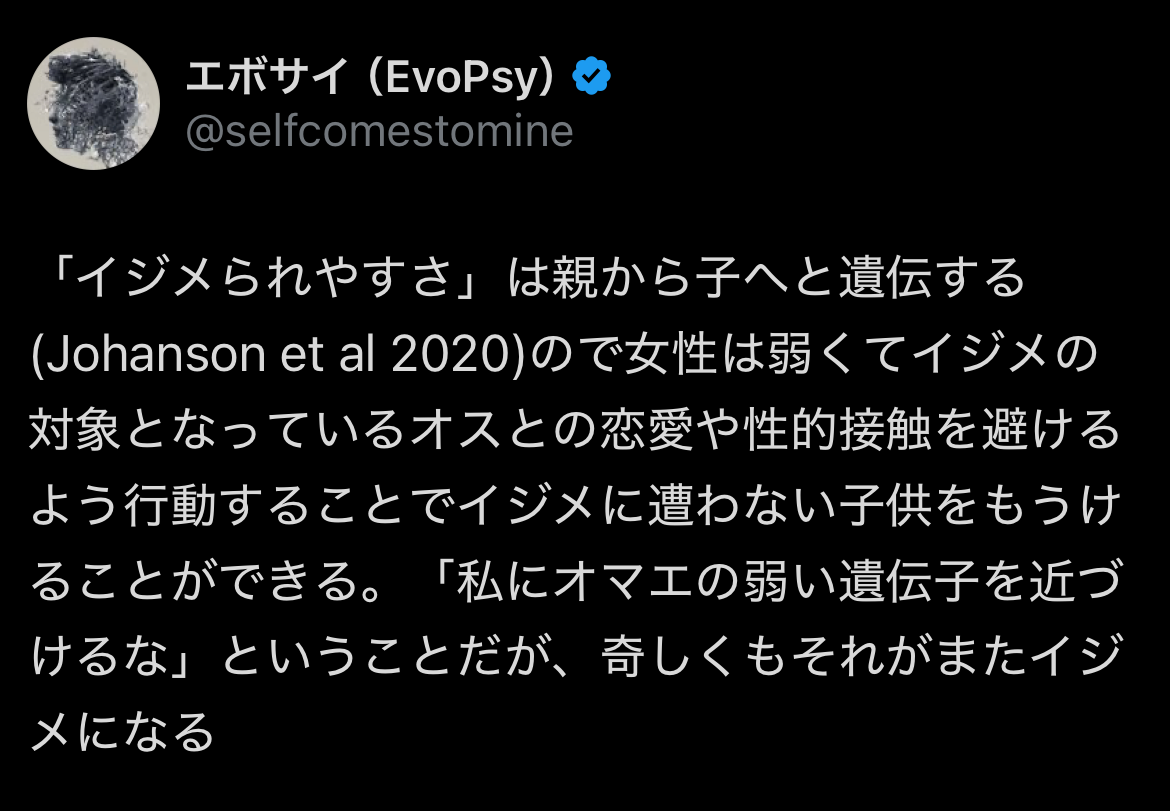 「イジメられやすさ」は親から子へと遺伝する(Johanson et al 2020)ので女性は弱くてイジメの対象となっているオスとの恋愛や性的接触を避けるよう行動することでイジメに遭わない子供をもうけることができる。「私にオマエの弱い遺伝子を近づけるな」ということだが、奇しくもそれがまたイジメになる
